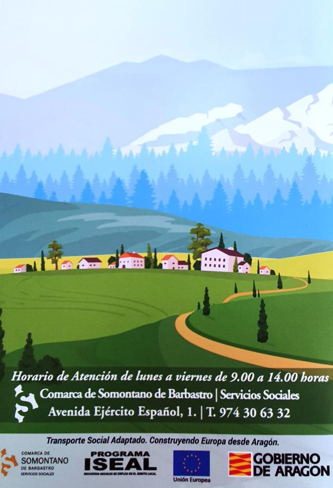 Si te interesa solicitar el Servicio del Transporte Social Adaptado debes contactar con los Servicios Sociales de la Comarca de Somontano. Con cita previa, una trabajadora social te atenderá para informarte del servicio y valorar la situación llamando al teléfono 974 30 63 32 en horario de lunes a viernes de 9horas a 14horas.