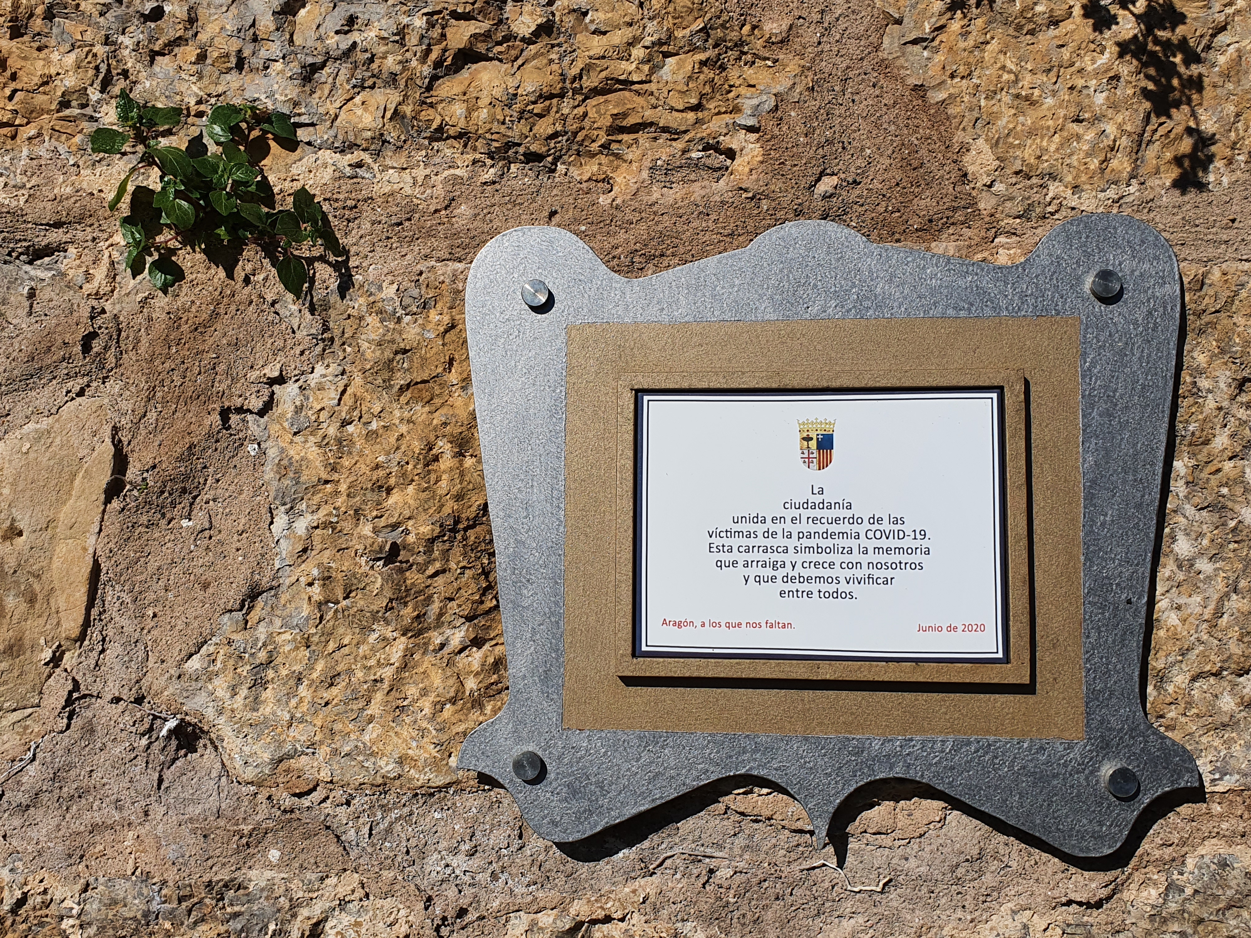 El acto llevó el nombre de “A los que nos faltan” y comenzó con la plantación de la carrasca, símbolo de la identidad de Aragón, una especie abundante en todos los territorios de España con el que se pretende manifestar la solidaridad, afecto, hermandad y causa común. A continuación se instaló una placa de cerámica elaborada en el Taller-Escuela de Muel y finalmente se procedió a la lectura de un texto de Manuel Vilas, premio de las Letras Aragonesas.