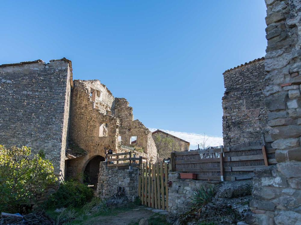 Las construcciones son resultado de una simbiosis de formas constructivas, unas propias del Somontano y otras características de las tierras montañosas del norte. Especialmente interesantes son los pasadizos que cubren algunos tramos de la calle, así como numerosos motivos decorativos en dovelas, dinteles y ventanas de las casas.