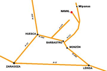 Naval se sitúa junto a la carretera A-2208, con buenos accesos desde Barbastro, permitiendo unas comunicaciones cómodas y rápidas con las principales ciudades de España: